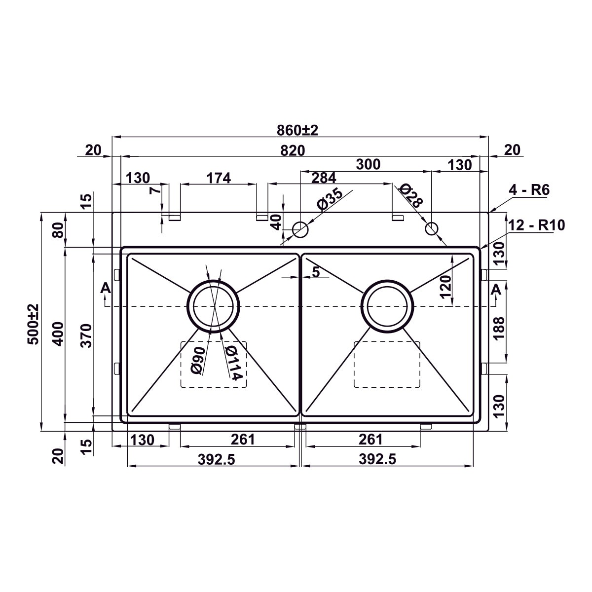 - Chậu đôi Workstation 567.94.024 – Kích thước: 860 x 500 x 200 mm