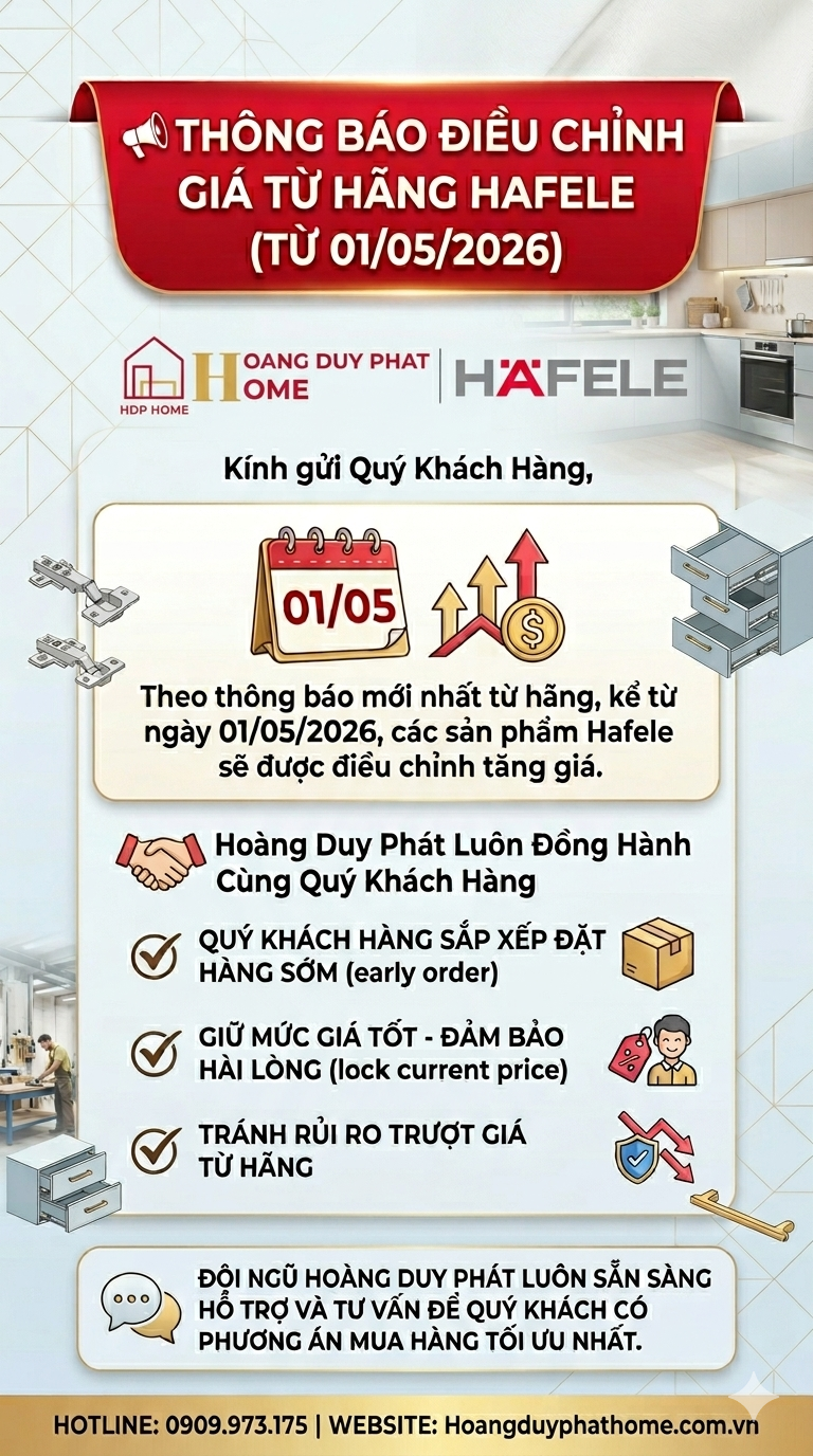 Theo thông báo mới nhất từ hãng, kể từ ngày 01/05, các sản phẩm Hafele sẽ được điều chỉnh tăng giá.